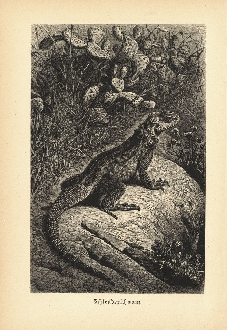 Schleuderschwanz, Echse. Buchillustration (Holzschnitt) von 1890