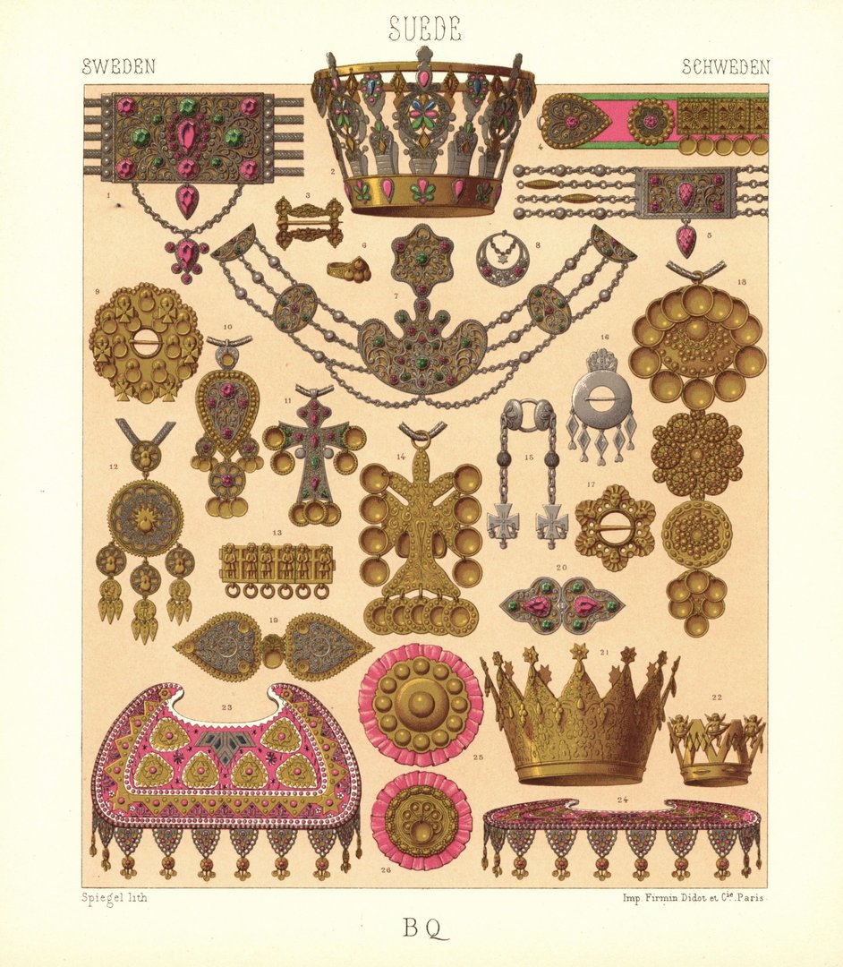 Schweden und Norwegen. Von Bäuerinnen getragener Schmuck, Metalle. Lithografie von 1888. (T417)