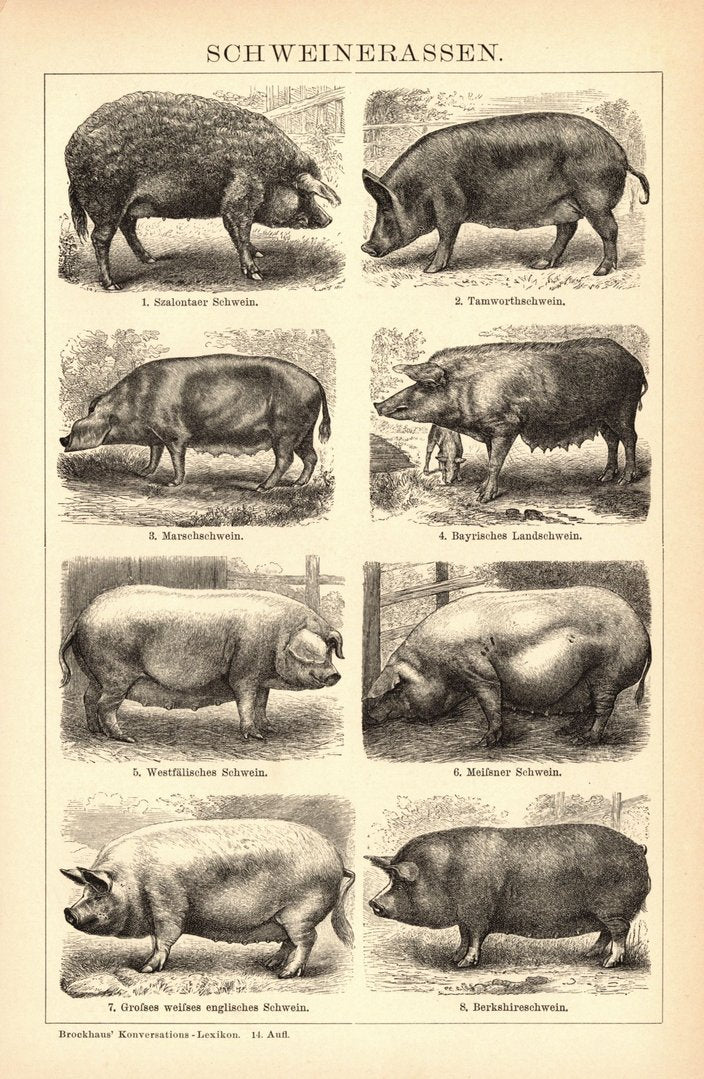 Schweinerassen. Buchillustration (Stich) von 1897