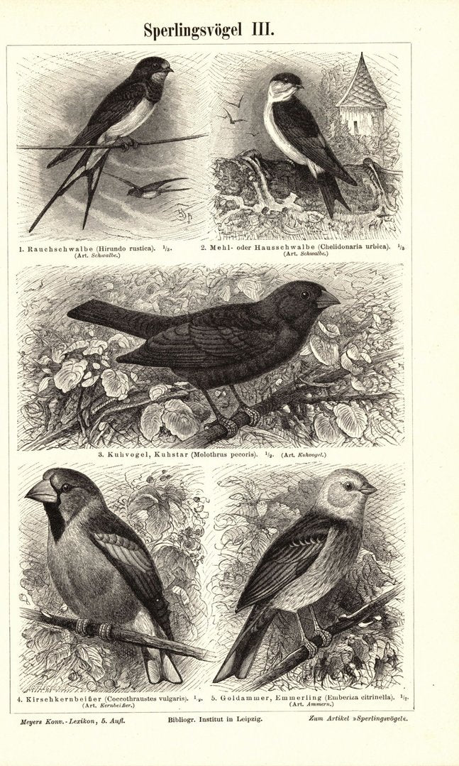 Sperlingsvögel III-IV. Buchillustration (Stich) von 1897