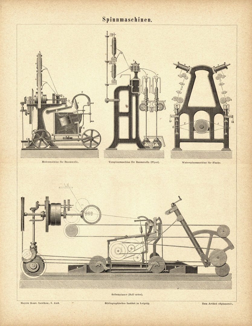 Spinnmaschinen. Buchillustration (Stich) von 1878