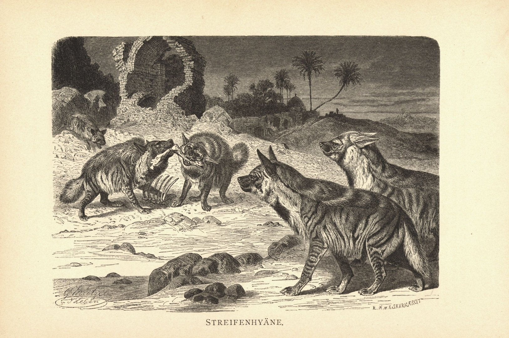 Streifenhyäne. Buchillustration (Holzschnitt) von 1890