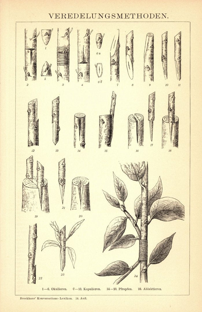 Veredelungsmethoden. Buchillustration (Stich) von 1897