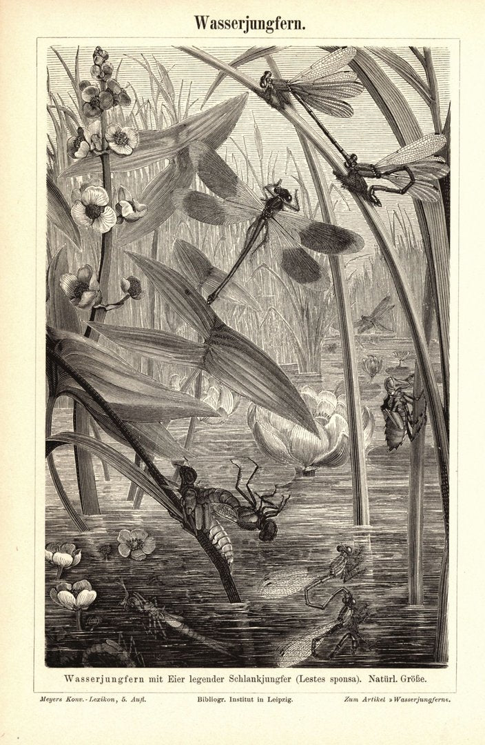 Wasserjungfern, Libellen. Buchillustration (Stich) von 1897