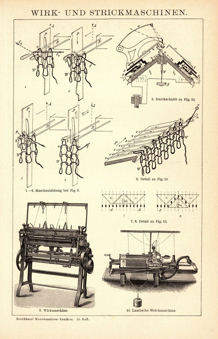 Wirk- und Strickmaschinen. Buchillustration (Stich) von 1897